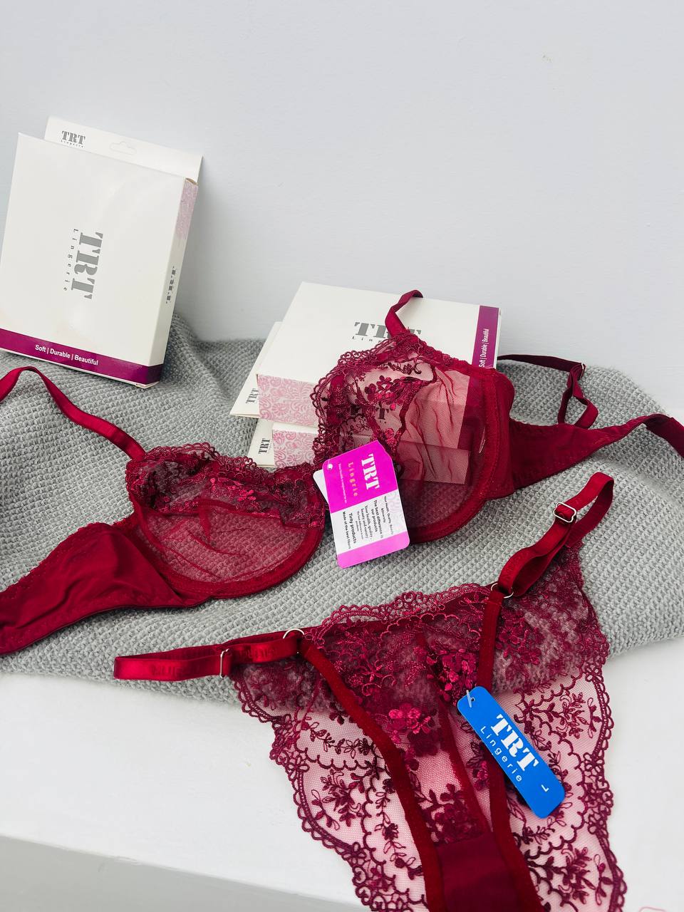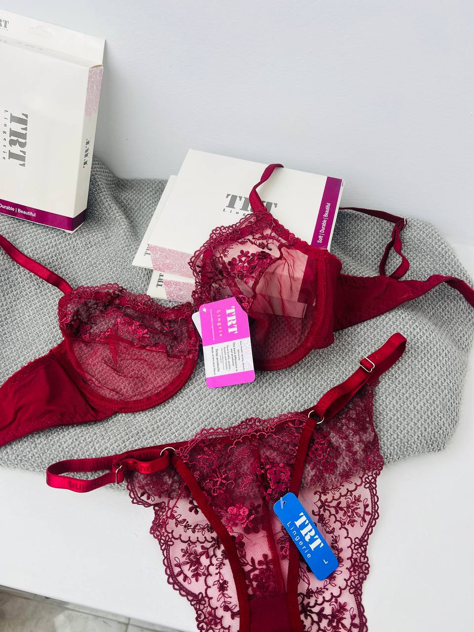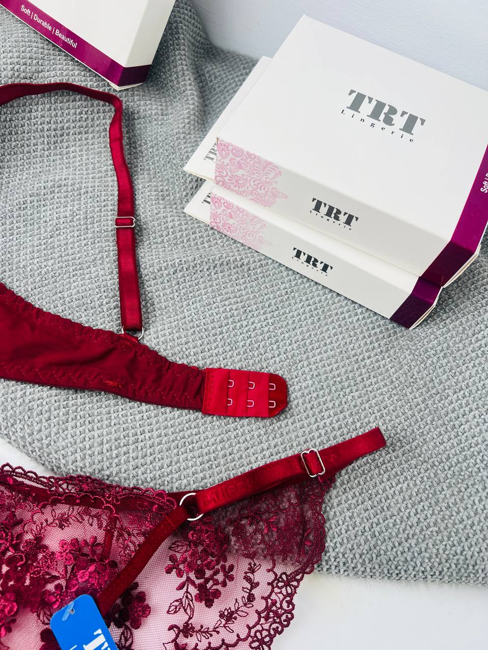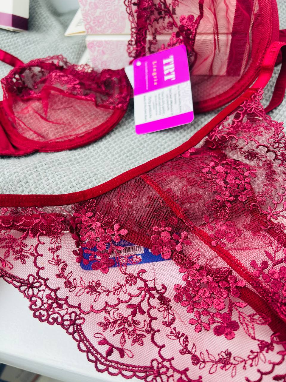 ست لباس زیر توری قرمز لیلا TRT – مدل Beautiful عینکی با تور گل‌دار فانتزی و فنر نرم ترکیه