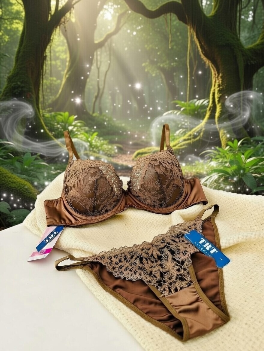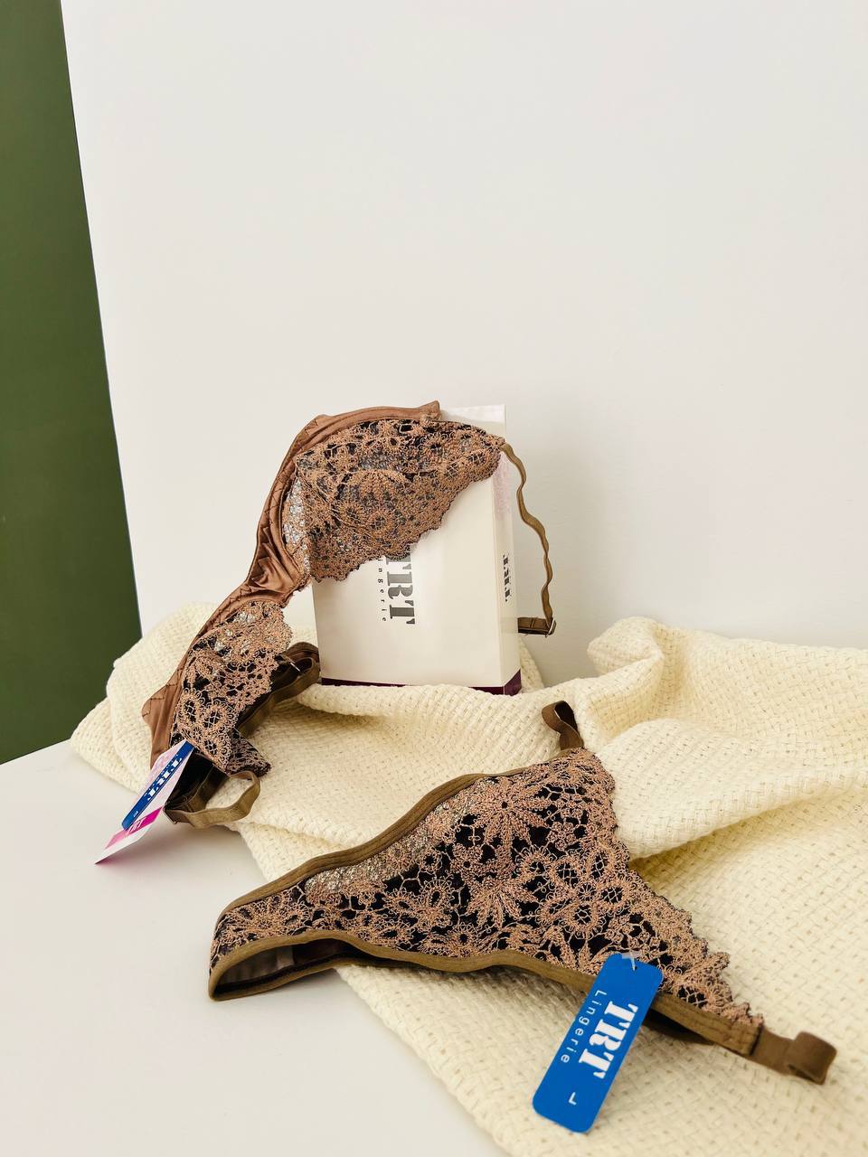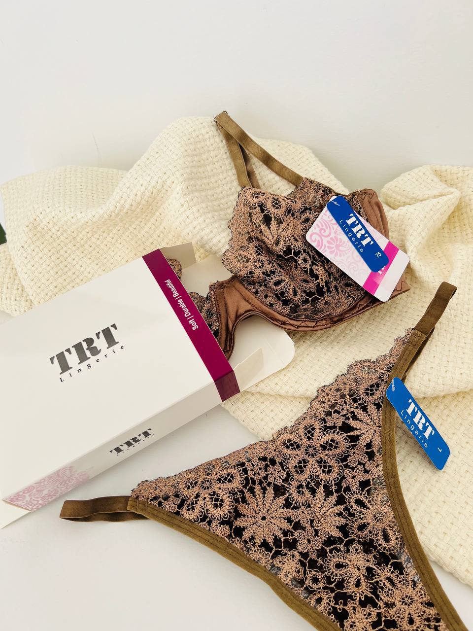 ست لباس زیر عمده توری قهوه‌ای TRT – مدل گل‌دوزی فنردار زنانه