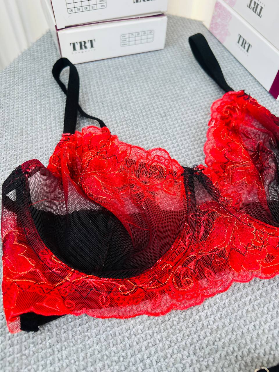 ست لباس زیر توری قرمز لیلا TRT – مدل Beautiful عینکی با تور گلدار فانتزی و فنر نرم ترکیه